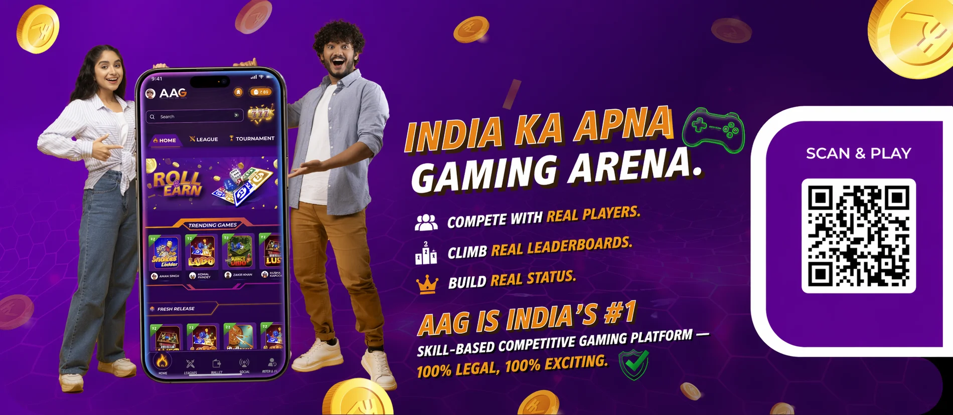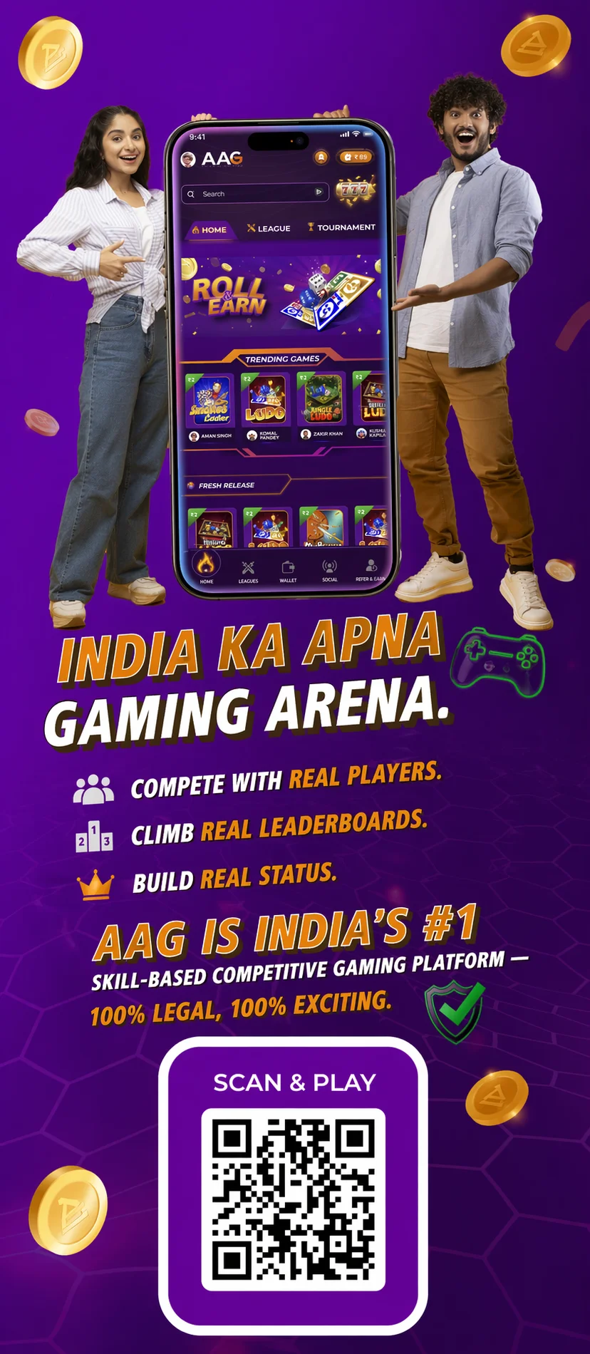 AAG is a real-money gaming platform in India that allows users to play and earn money by playing online games. You can participate in games like Ludo, Snake & Ladders, and more, and earn real cash rewards based on your performance.