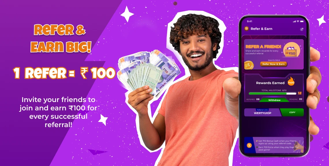 Share your referral link on your social media, YouTube, gaming groups, or with your personal network. Explain that it’s a real money gaming app with fun and low entry fees to boost signups.